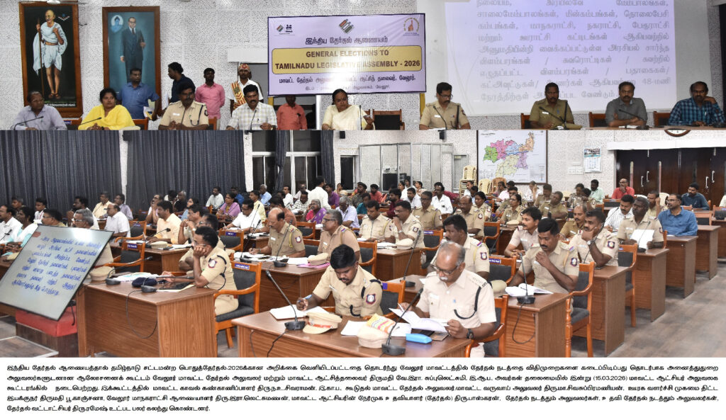 இந்திய தேர்தல் ஆணையத்தால் தமிழ்நாடு சட்டமன்ற பொதுத்தேர்தல்-2026க்கான அறிக்கை வெளியிடப்பட்டதை தொடர்ந்து வேலூர் மாவட்டத்தில் தேர்தல் நடத்தை விதிமுறைகளை கடைப்பிடிப்பது தொடர்பாக அனைத்துதுறை அலுவலர்களுடனான ஆலோசனைக் கூட்டம் வேலூர் மாவட்ட தேர்தல் அலுவலர் மற்றும் மாவட்ட ஆட்சித்தலைவர் திருமதி வே.இரா. சுப்புலெட்சுமி, இ.ஆ.ப., அவர்கள் தலைமையில் இன்று (15.03.2026) மாவட்ட ஆட்சியர் அலுவலக கூட்டரங்கில் நடைபெற்றது..
